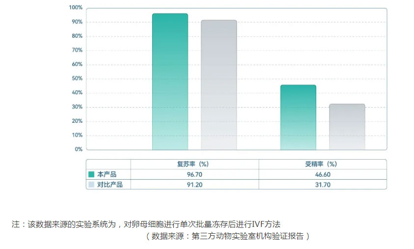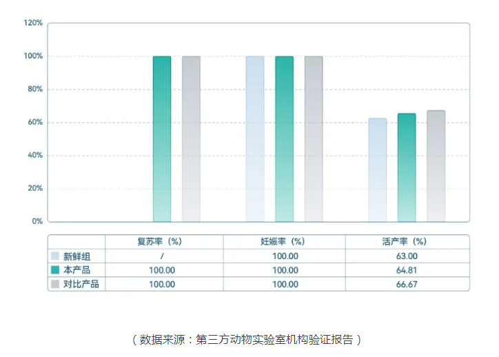 驗(yàn)證數(shù)據(jù)顯示,無(wú)論是原核期胚胎、卵裂期胚胎,經(jīng)玻璃化冷凍解凍后,胚胎發(fā)育數(shù)據(jù)與新鮮胚胎及對(duì)比產(chǎn)品均無(wú)顯著性差異。將復(fù)蘇胚胎移植至小鼠母體后,妊娠率、活產(chǎn)率與新鮮胚胎組、對(duì)比產(chǎn)品組沒(méi)有顯著性差異,實(shí)現(xiàn)胚胎冷凍對(duì)發(fā)育潛能的 “零損耗”。