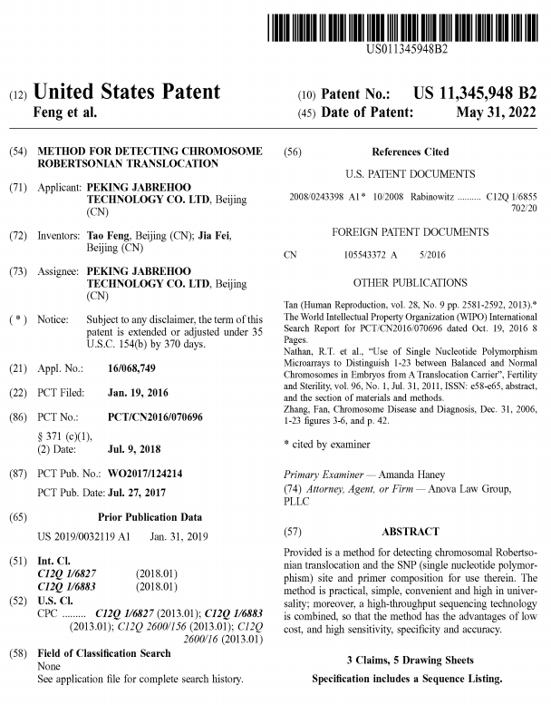 嘉寶仁和S-PGD“一種檢測染色體羅氏易位的方法”早在2016年獲得國家專利授權(quán)( 201610034367.4),近日該技術(shù)再獲美國專利授權(quán)。