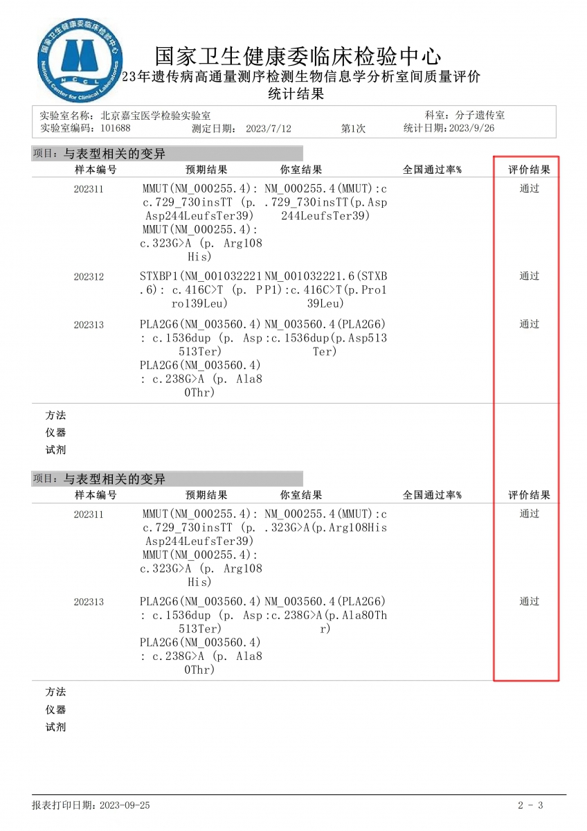 2023年嘉寶醫(yī)學(xué)檢驗(yàn)實(shí)驗(yàn)室遺傳病高通量測(cè)序檢測(cè)生物信息學(xué)分析室間質(zhì)量評(píng)價(jià)統(tǒng)計(jì)結(jié)果