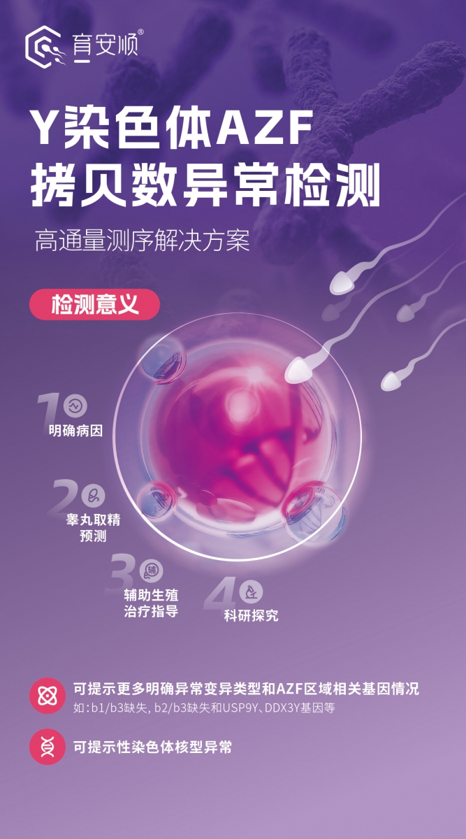 育安順®Y染色體AZF拷貝數(shù)異常檢測,結(jié)合目標區(qū)域捕獲技術(shù)及高通量測序技術(shù),采用Y染色體AZF區(qū)微缺失檢測試劑盒(專利號ZL 2015 1 0679999.1),檢測AZF區(qū)域拷貝數(shù)異常(缺失、重復(fù)、倒位等)的具體區(qū)域和大小以及相關(guān)基因情況,從而為男性不育患者提供科學(xué)的臨床治療方案和遺傳咨詢指導(dǎo)。